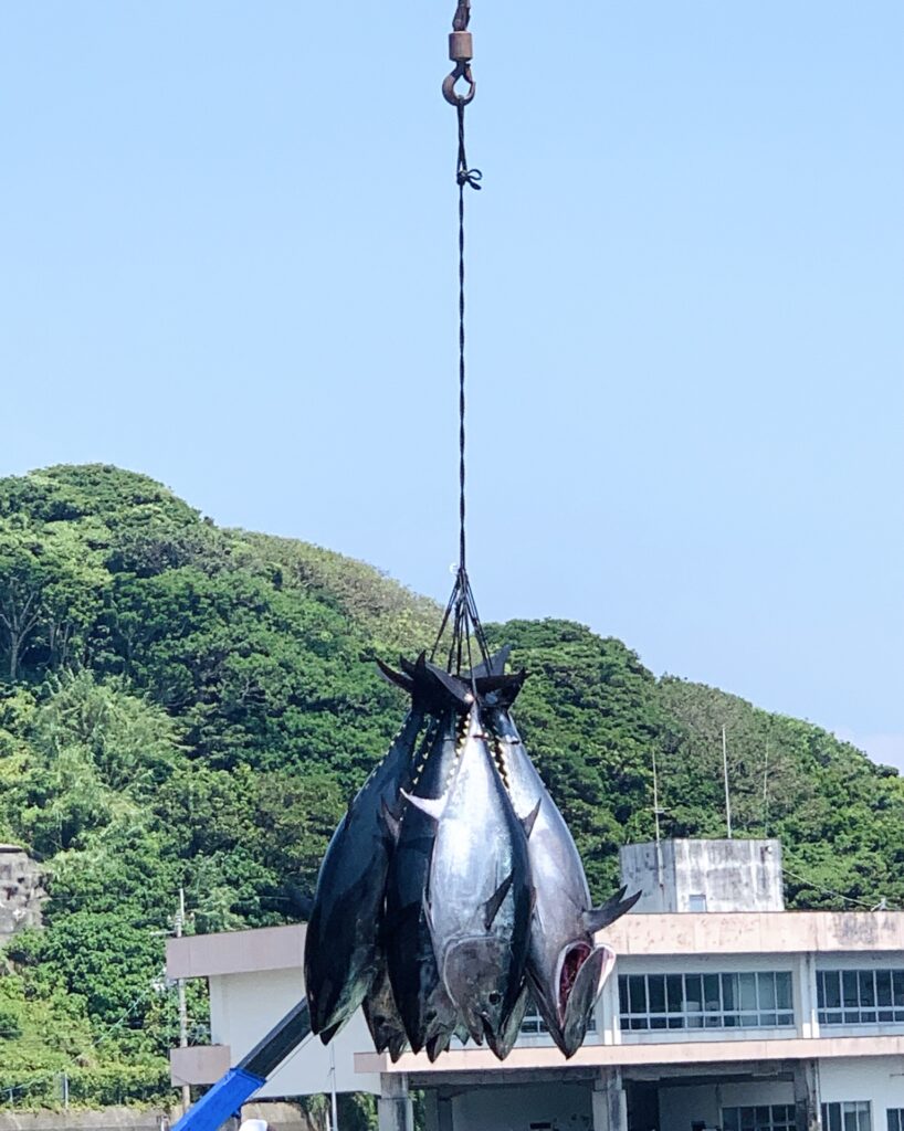 陸にはマグロを巻き上げるために、クレーン車が用意されていたて短尺状にしてクレーンにマグロが釣り上げられていく。